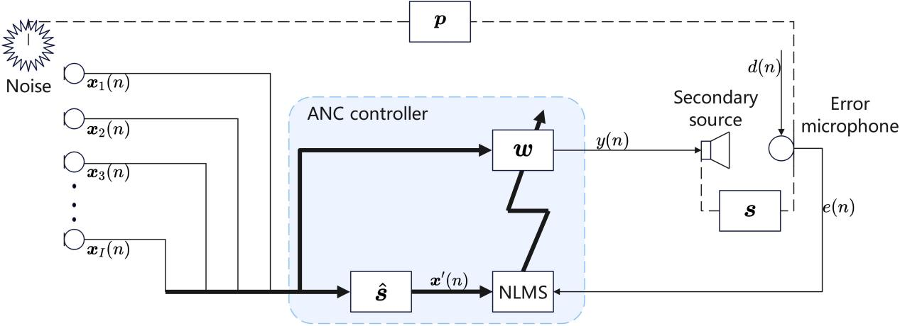 多通道前馈 ANC 系统利用多个参考麦克风和多个扬声器,可比单通道系统获得更优降噪效果。然而通道数增加会导致滤波器规模和计算量迅速上升,影响实时性和系统稳定性。