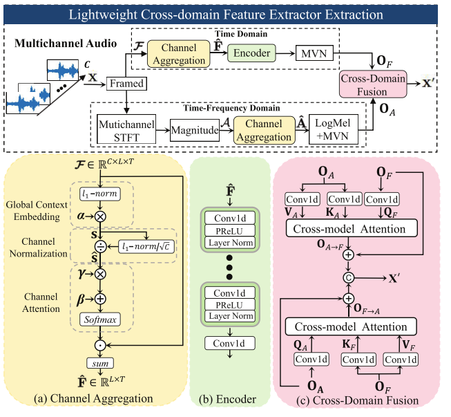 本文提出一种 轻量级跨域前端特征提取器(Lightweight Cross-Domain Feature Extractor, L-CD-FE),通过在 时域与频域(cross-domain)联合建模 的方式,有效融合空间差异与语音结构信息。